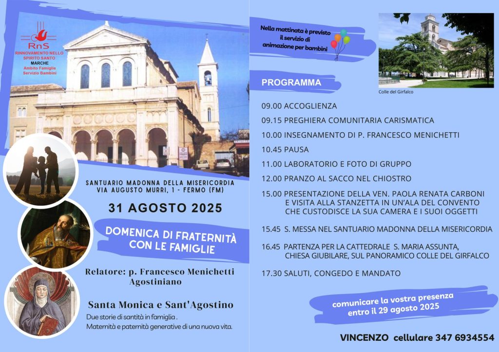 Le famiglie del Rinnovamento nelle Spirito Santo della Regione Marche, sono invitate a vivere una domenica di fraternità a Fermo, nel convento degli Agostiniani Scalzi, annesso al Santuario della Madonna della Misericordia. A lanciare l’invito sono Vincenzo Vallese e Amalia Gasparrini, delegati regionali per l’ambito evangelizzazione famiglie del Rinnovamento nello Spirito Santo, regione Marche.