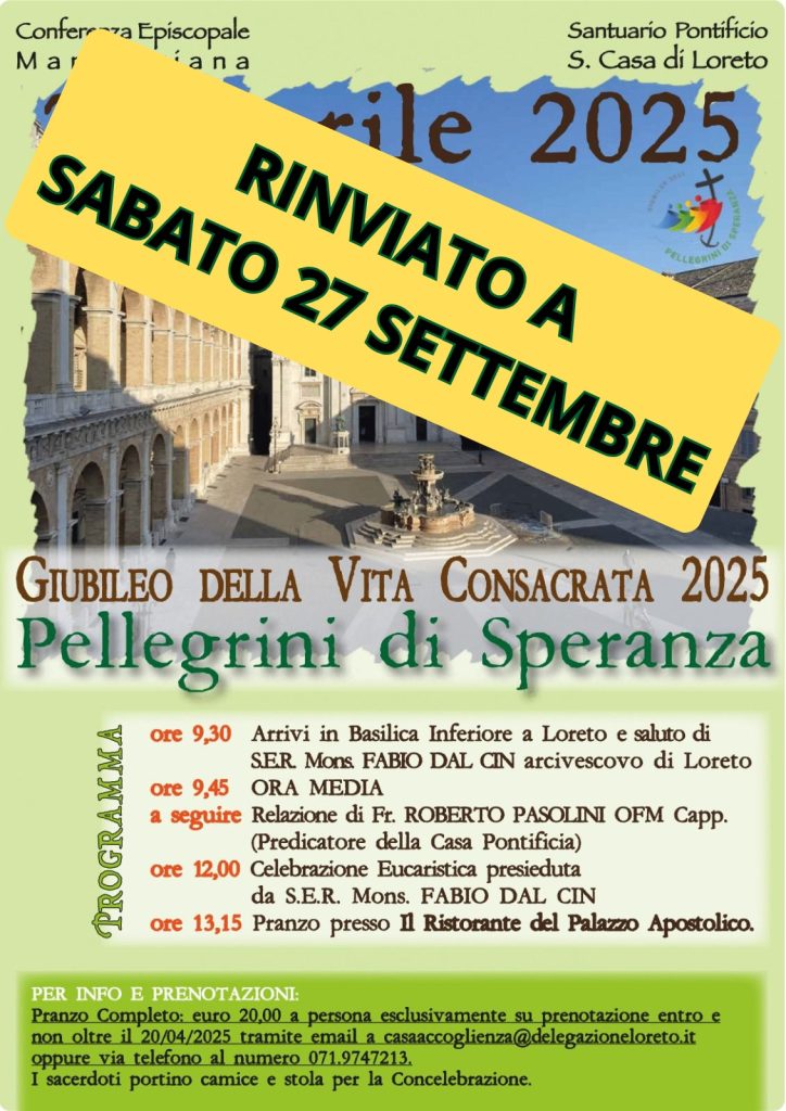 Si avvisa che la giornata giubilare regionale per la vita consacrata prevista per il 25 aprile 2025 è stata rinviata a sabato 27 settembre p.v. con lo stesso programma, maggiori dettagli saranno comunicati successivamente.