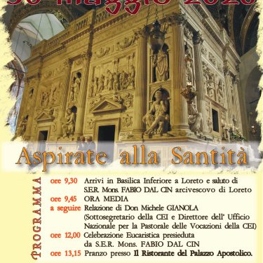 Programma della giornata: 9:30 - Arrivi in Basilica Inferiore a Loreto e saluto di S.E.R. Mons. Fabio Dal Cin, Arcivescovo di Loreto 9:45 - Ora Media 10:00 - Relazione di don Michele Gianola, Sottosegretario CEI e Direttore dell'Ufficio Nazionale per la Pastorale delle Vocazioni della Cei 12:00 - Celebrazione Eucaristica…