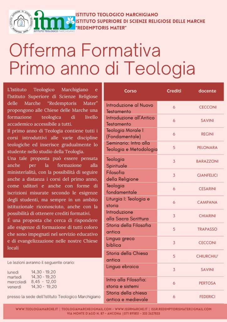 L’Istituto Teologico Marchigiano e l’Istituto Superiore di Scienze Religiose delle Marche propongono alle Chiese delle Marche una formazione teologica di livello accademico accessibile a tutti.