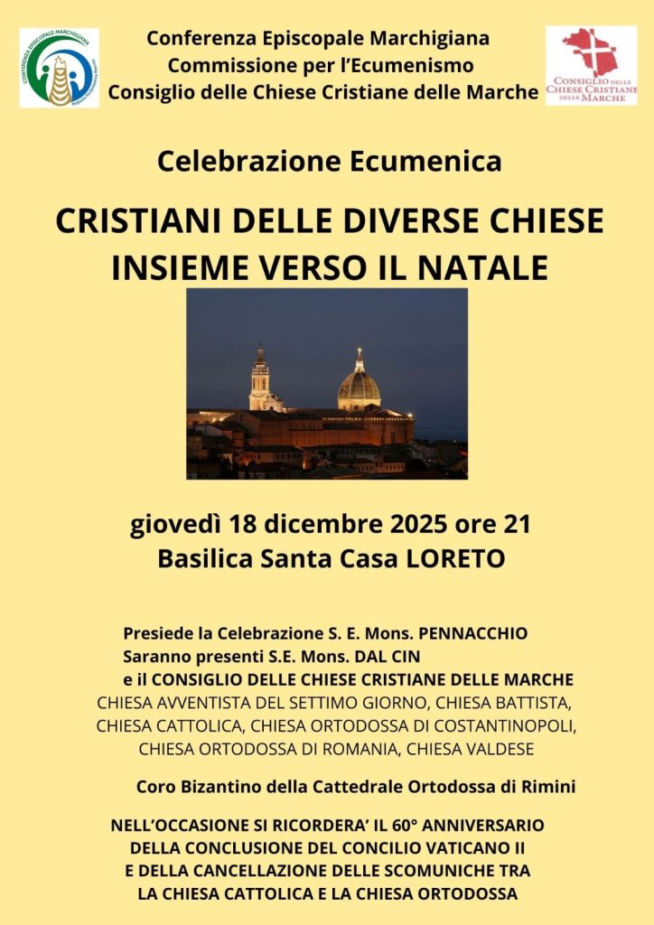 NewsCristiani delle diverse Chiese insieme verso il NataleGiovedì 18 dicembre 2025 ore 21:00 - Basilica Santa Casa di Loreto Partecipano S.E.Mons. Fabio Dal Cin, S.E.Mons. Rocco Pennacchio e il Consiglio delle Chiese Cristiane delle Marche. lunedì 1 Dicembre 2025martedì 9 Dicembre 2025