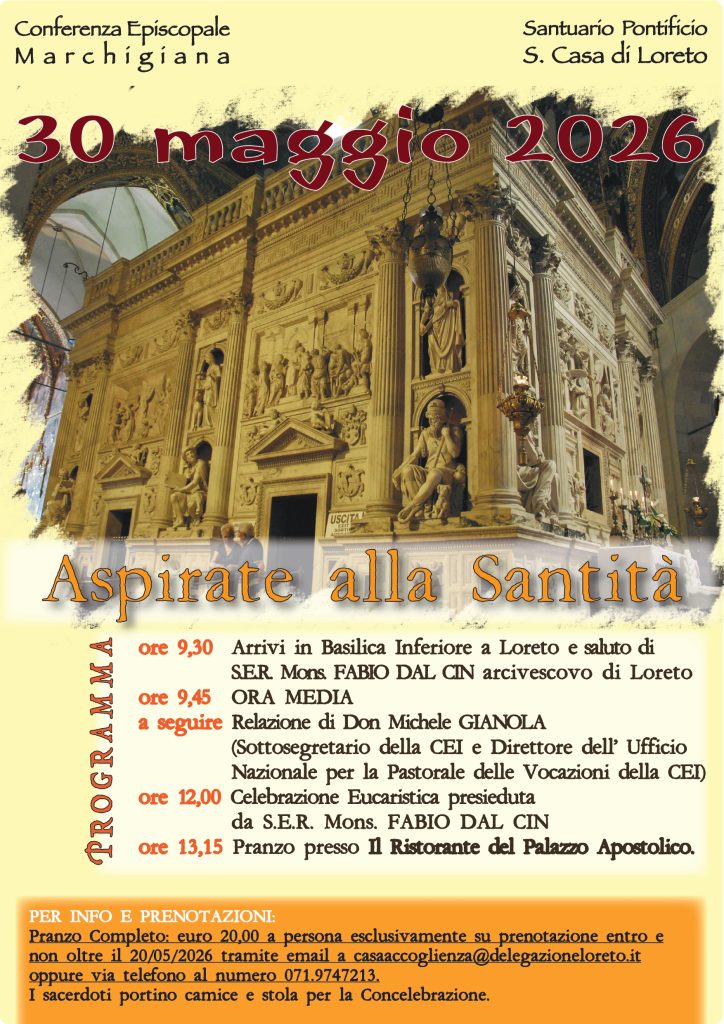 9:30 – Arrivi in Basilica Inferiore a Loreto e saluto di S.E.R. Mons. Fabio Dal Cin, Arcivescovo di Loreto