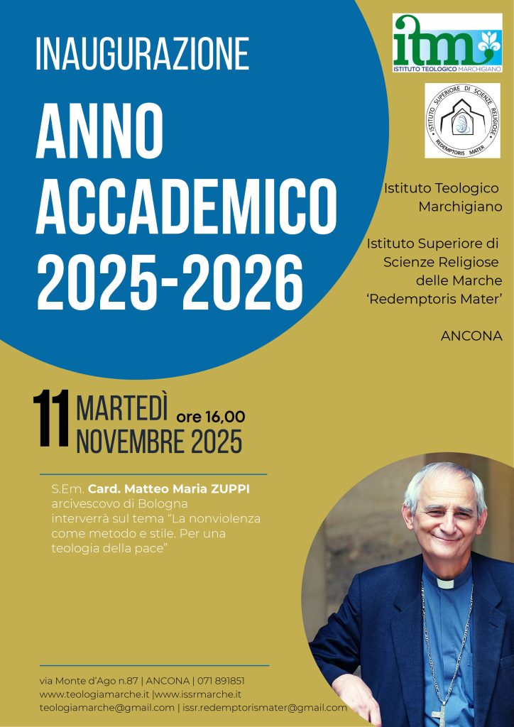 L’Istituto Teologico Marchigiano e l’Istituto Superiore di Scienze Religiose delle Marche “Redemptoris Mater” sono lieti di comunicare che il prossimo martedì 11 novembre 2025, alle ore 16.00, ci sarà l’inaugurazione dell’Anno Accademico 2025/26. La prolusione sul tema della pace nel mondo sarà tenuta da S.Em. Rev.ma Card. Matteo Zuppi, Arcivescovo di Bologna e Presidente della Conferenza Episcopale Italiana.