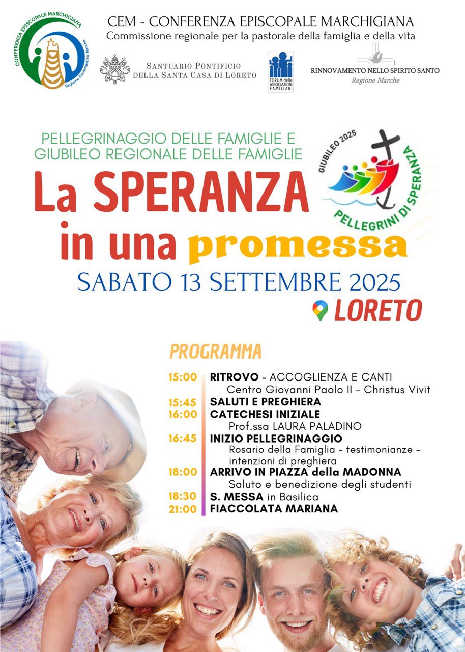 Sabato 13 settembre 2025, dalle ore 15.00, le famiglie della nostra regione si troveranno insieme per un momento di preghiera e di canti, presso il Centro Giovanni Paolo II – Christus Vivit a Montorso di Loreto. Sarà presente la biblista Laura Palladino che introdurrà il pellegrinaggio con una catechesi dal titolo “La speranza in una promessa”.