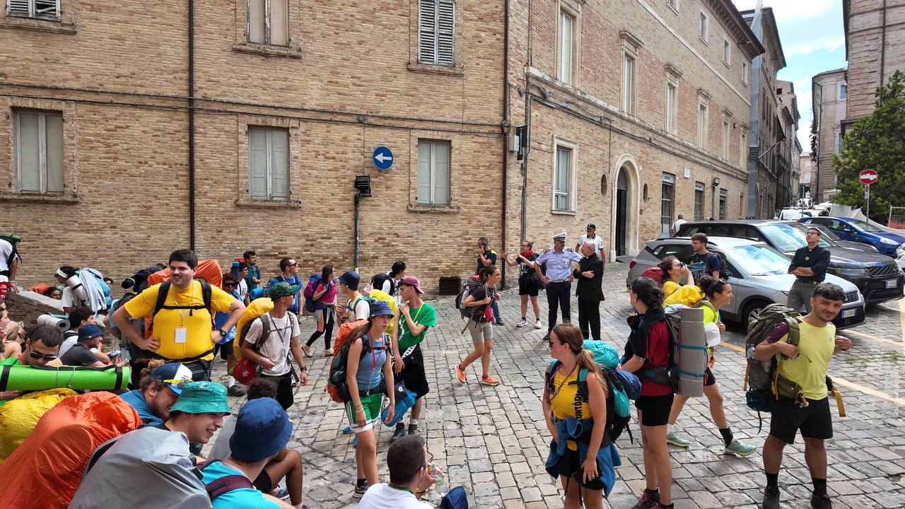Tappa a Macerata per i ragazzi e le ragazze in cammino da Loreto a Roma per il Giubileo dei giovani. Ad accogliere i circa 300 partecipanti provenienti da tutta la regione Marche è stato il vescovo di Macerata mons. Nazzareno Marconi, accompagnato dagli assessori Paolo Renna e Katiuscia Cassetta. A supervisionare il tragitto e a garantire la sicurezza dei pellegrini durante l’arrivo in centro storico gli agenti della Polizia locale guidata dal comandante Danilo Doria.